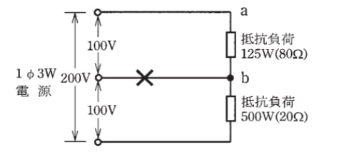 図のような単相3線式回路において、消費電力125W、500Wの2つの負荷はともに抵抗負荷である。