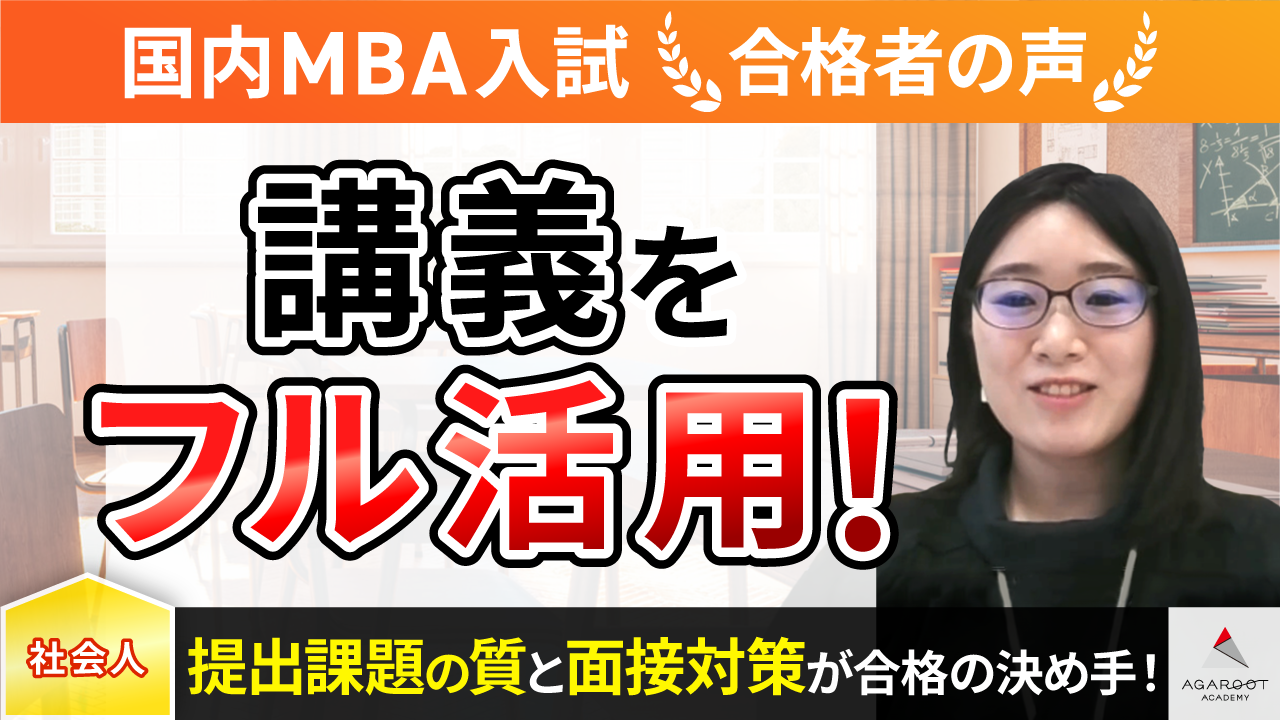 現職のため、仕事、プライベート、勉強、全て両立させなければいけないため、通学するために時間を使用したくなく、隙間時間を効率よく利用しMBAの対策をしたかったため、アガルートアカデミーを選びました。