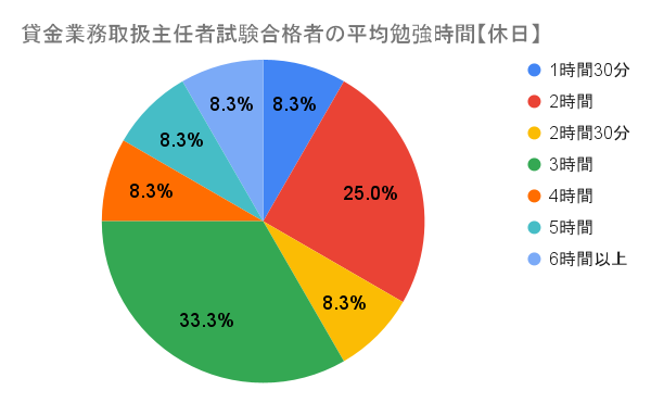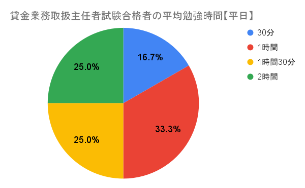 以上のことから、貸金業務取扱主任者試験に合格した人の勉強時間の多くは、平日1時間、休日3時間という結果になりました。