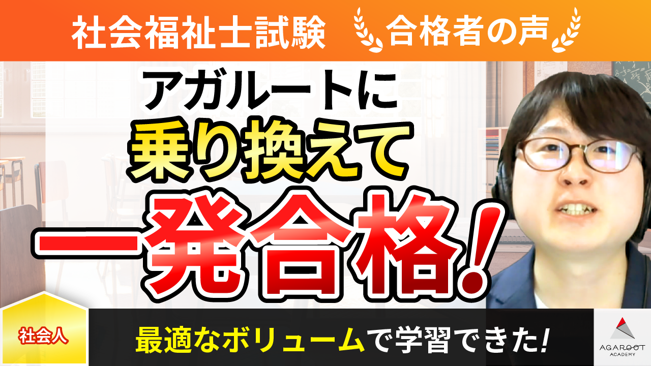 先生の講義とてもよかったです。今年のアガルートの講義を受けられて本当によかったと思っています。退屈だと感じていた社会福祉士の勉強を有意義な楽しいものに変えていただきありがとうございました!