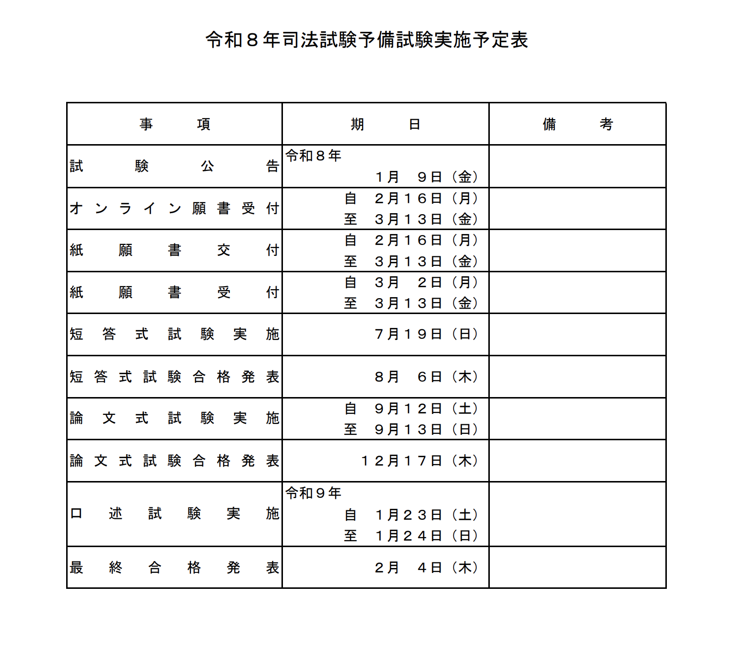 予備試験の試験日は短答式試験が令和8年7月19日(日)、論文式試験が令和8年9月12日(土)、13日(日)、口述式試験が令和9年1月23日(土)、24日(日)となっています。