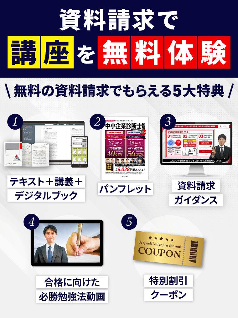 アガルートアカデミーの中小企業診断士試験 2次試験対策パックでは、2次試験の戦略講座や6年分の過去問解説講座を受けられます。