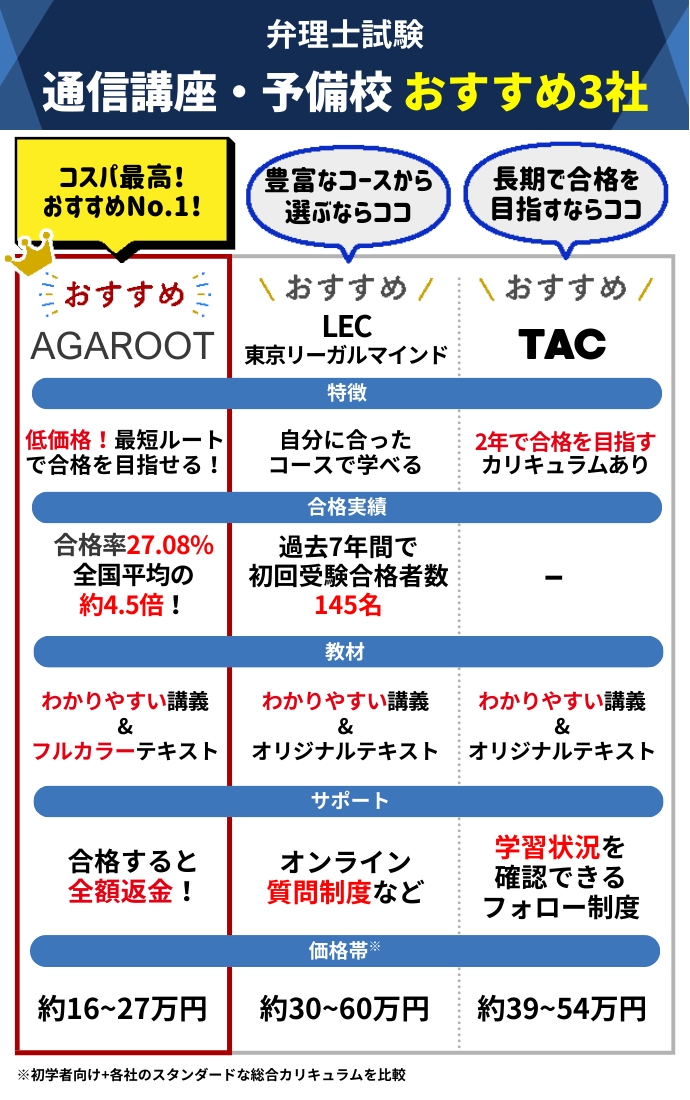 | アガルート | 162,800円〜272,800円 | 狙われやすい箇所を徹底精査した講師書き下ろしテキストで効率的に学習。 | 各種割引制度あり。合格特典で全額返金もあり。 |