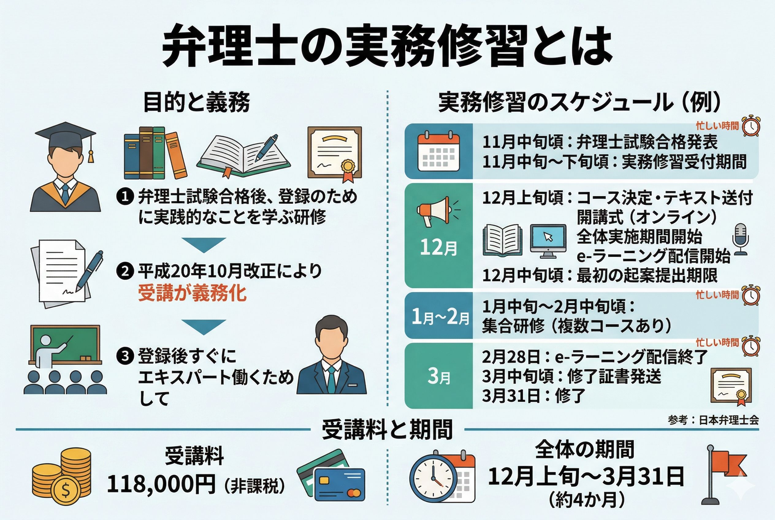 ・修習は例年12月~3月にかけて行われるもので、費用は118,000円となっている