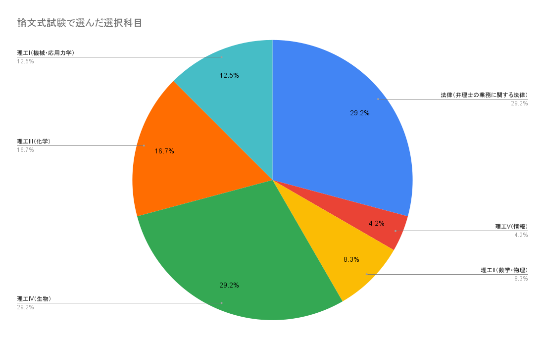実際にアガルート受講生に取ったアンケートでは、選択科目が「法律(弁理士の業務に関する法律)」と「理工IV(生物)」で29.2%と同等になりました。