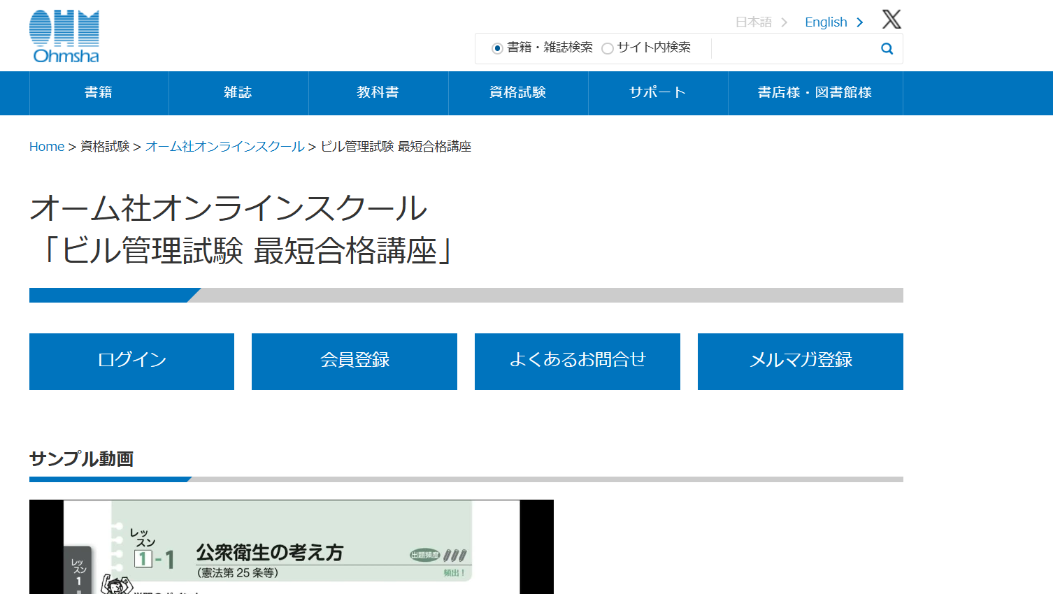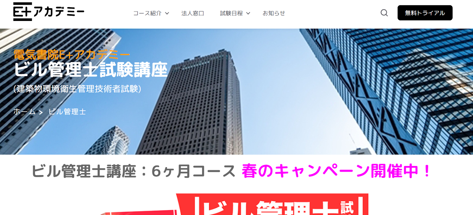 | 電気書院 E+アカデミー | 12か月コース(書籍付き):39,600円 6か月コース(書籍付き):24,750円 | 『ビル管理士試験模範解答集』をeラーニングで学べる 過去問題が豊富 各科目の出題傾向とポイントを動画で学べる | 学習理解度をひと目で把握できるテスト機能 有料の模擬試験あり |