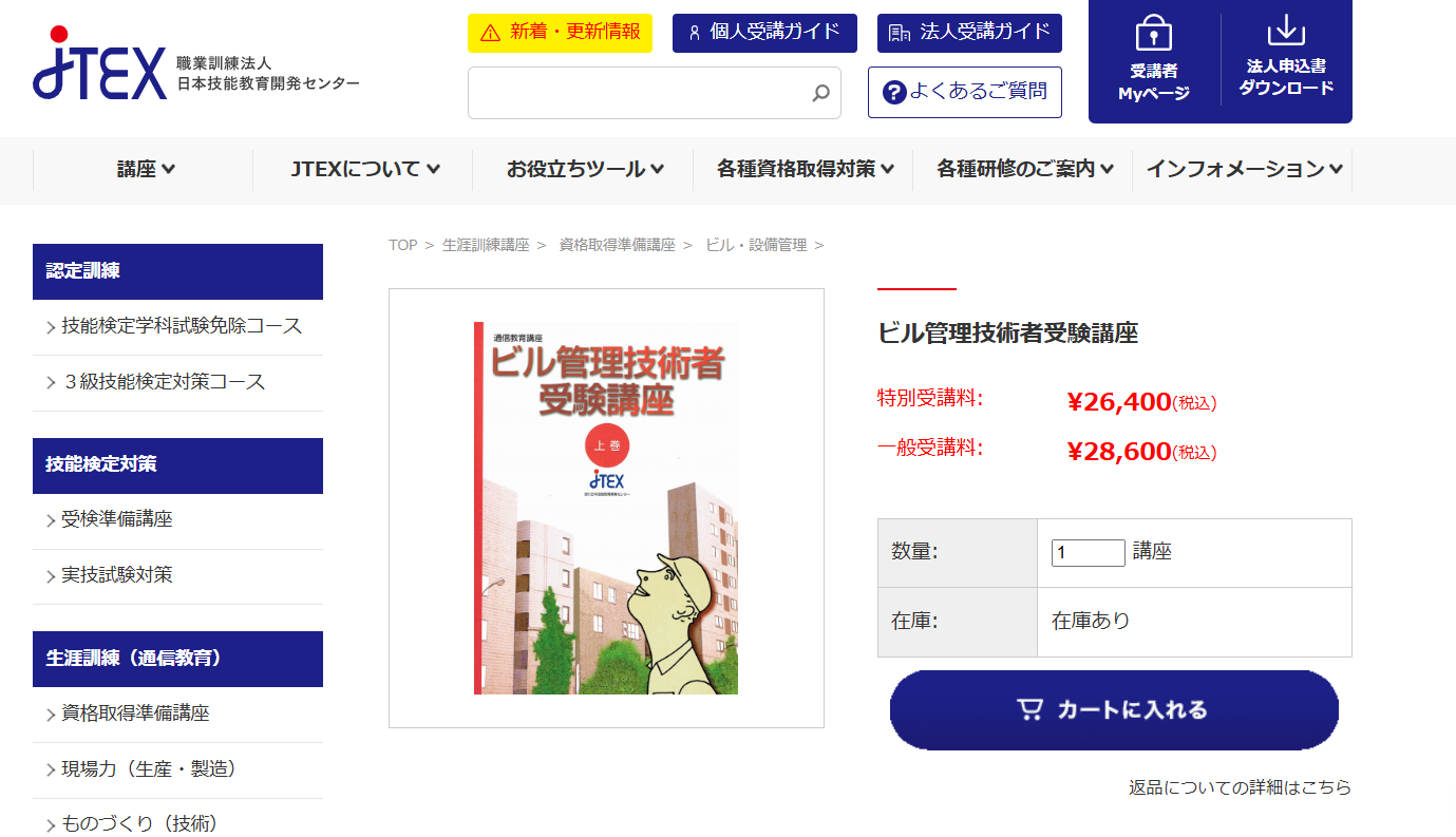 - ビル管理技術者受験講座(一般受講料):28,600円(税込)