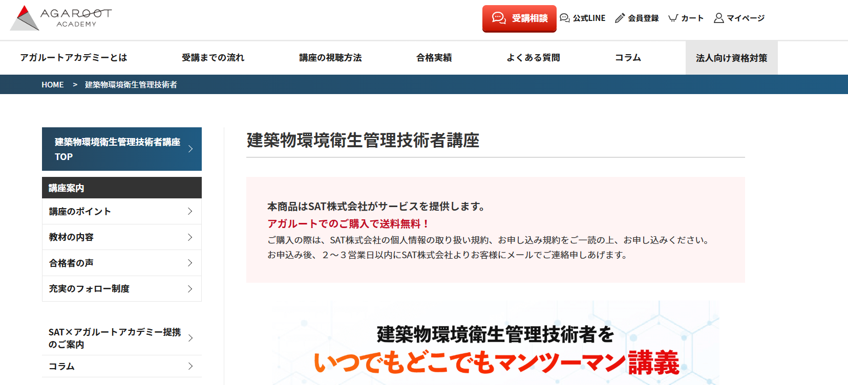 アガルートの建築物環境衛生管理技術者講座は、講座内容の充実度と学習効率の高さが特徴です。