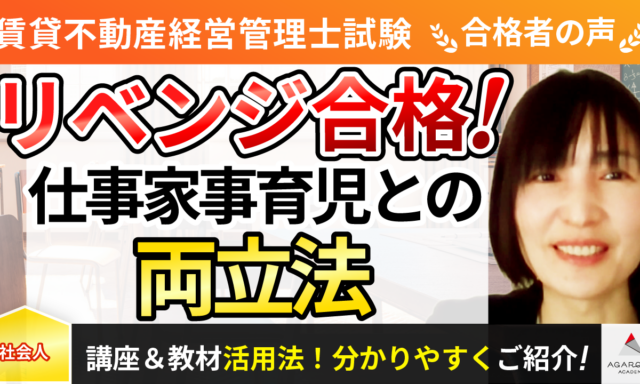 賃貸不動産経営管理士を取得するにあたり、自分に何かプレッシャーを与えなければ絶対に合格できないなと思いました。 そこで予備校を使用することを決め、色々な予備校と比較する中で、講師の先生方のわかりやすさや、テキストの充実度などを見てアガルートアカデミーの講座に決めました。