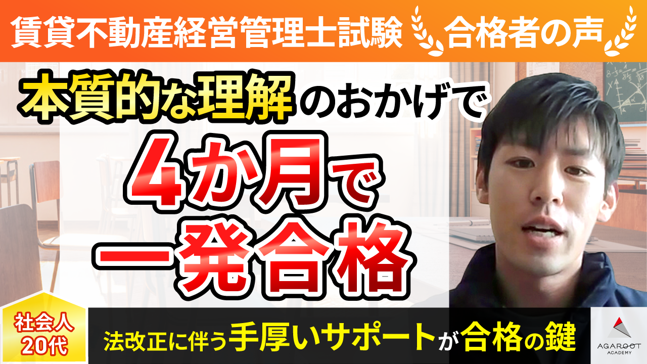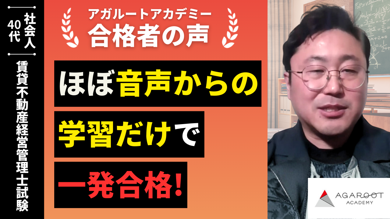 この資格の歴史が浅く、宅建に比べて独学で学ぶための教材の質があまり高いように感じなかったので、スクールを利用しようと思いました。特にアガルートさんの合格率の高さに頼もしさを感じたので講座を受講しようと決めました。
