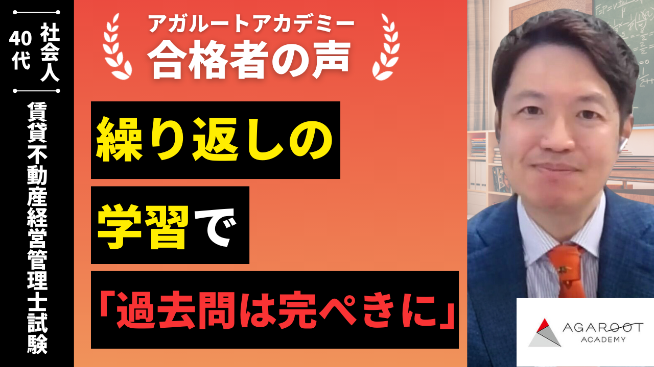 令和五年度試験の不合格を経て、再挑戦する事を決意。前回の勉強期間は3か月でしたが、今回は10か月。じっくりと腰を据えて勉強する事にしました。初めに目標設定。平日1時間・休日2時間と勉強する事。次の教材が送られてくるまでに、現在の講座をすべて終わらせる事を目標にしました。工藤先生の「とにかく進む」を胸に、「すき間時間に音声講義を聞く→動画視聴→過去問→先生に不明点を質問」の繰り返しを実践。前年の勉強で解釈が足りなかった事、間違えて覚えていた事を、工藤先生の講義でブラッシュアップされる喜びを感じました。過去問を間違える度に苛立つ事がありましたが、工藤先生から「始めは間違えても当たり前」のアドバイスを頂戴し、すべての問題集を5周ずつ挑みました。またケアレスミスが多いので、どうしてこの選択肢を選んだのか、その理由を回答と共にノートに簡潔かつ詳細に記載する事を心掛けました。前年とは違い長丁場の為、気が緩みがちでしたが、「試験合格がゴールではない。今後の実務に生かす」と自分に言い聞かせ、工藤先生の毎月のホームルームや不動産関連のニュース等に目を通し、勉強意欲を失わないようにしながら、10か月間の勉強期間を過ごし、無事に合格する事が出来ました。