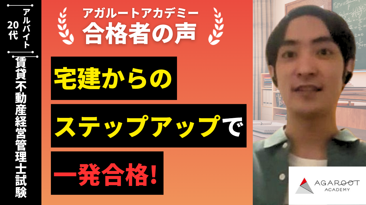 宅建を勉強した時はYouTube等などを使い独学で勉強をしていました。しかし賃管士試験はあまりそういうものがなかったので、どうしようか考えていた所、資格の通信講座を調べてアガルートの合格実績に惹かれてアガルートの講座を受講しようと決めました。