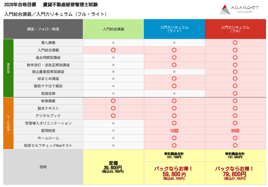 アガルートの賃貸不動産経営管理士の講座には、総合カリキュラムと総合講義があります。受講料(税込)は下記の通りです。