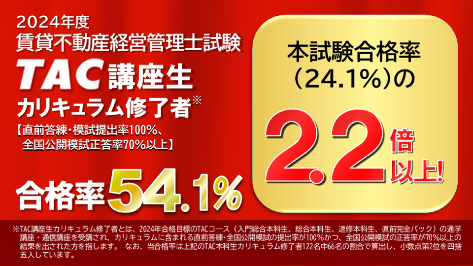 合格率の全国平均が24.1%であるため、アガルート受講生の合格率は全国平均の約3.4倍と非常に高い実績であることがわかります。
