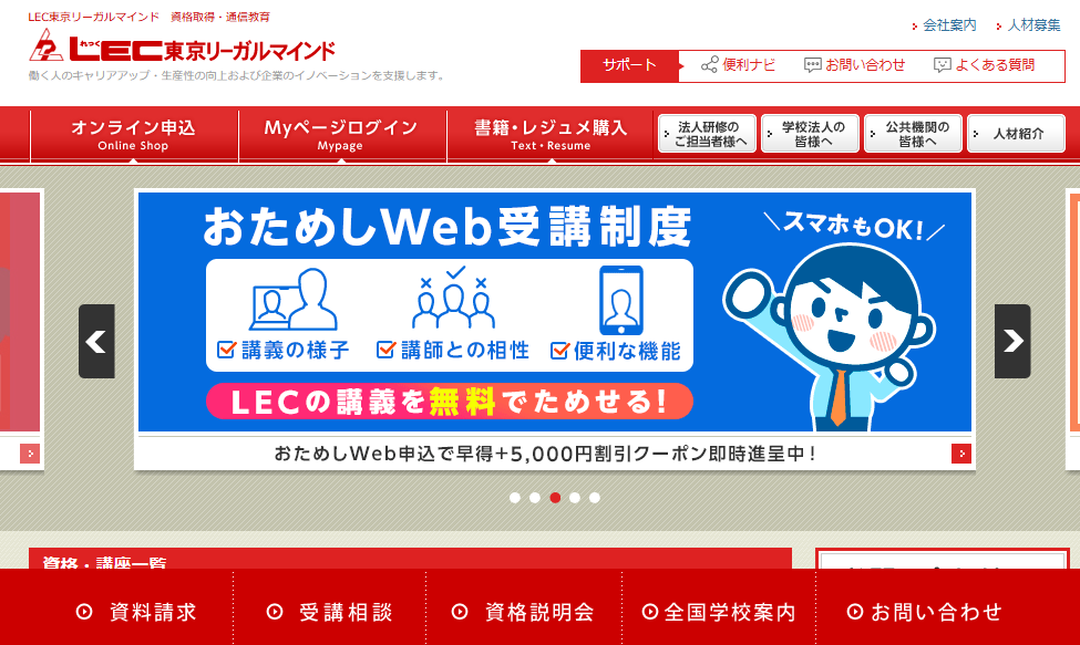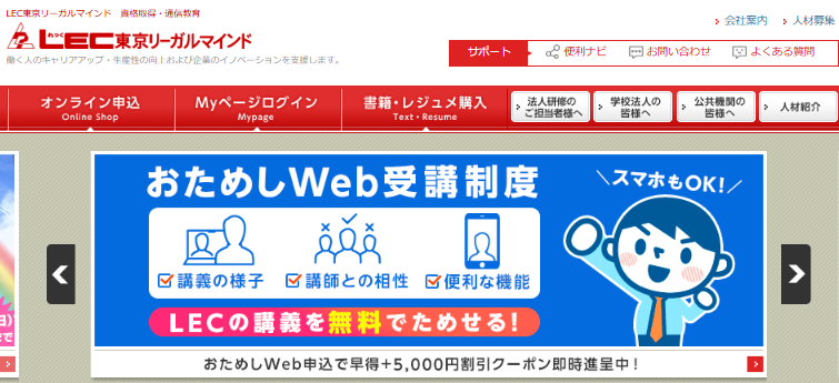 | LEC(合格フルパック【Web通信】) | 82,500円 | 2024年度試験合格体験記が4件あり | 宅建士や不動産鑑定士などを手掛けたベテラン講師が中心。 | 市販もされている合格のトリセツシリーズを使用。 | 合格体験記執筆代5000円or3000円。 |