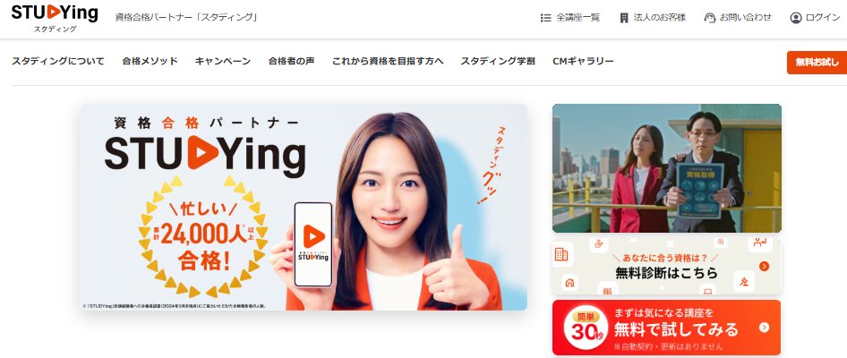 スタディングもオンライン資格講座です。オンラインに特に特化しており、紙の教材はないのが特徴です。