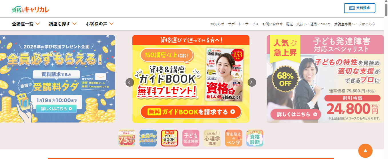 | キャリカレ(Cコース) | 63,800円 | 情報なし | サポートが手厚い | オリジナルテキストのARアイコン読み込みで映像講義の視聴が可能。 | 不合格なら全額返金保証制度・質問無料・合格後は2講座目無料など |