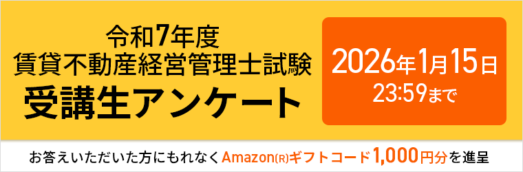 賃貸不動産経営管理士試験の有料講座を受講され(※2025年合格目標以前で受講年問わず)、令和7年度本試験に受験申込をされた方を対象として、合否確認を含む簡単なアンケートを実施しております。お答えいただいた方にはもれなくAmazon(R)ギフトコード1,000円分を進呈いたします。