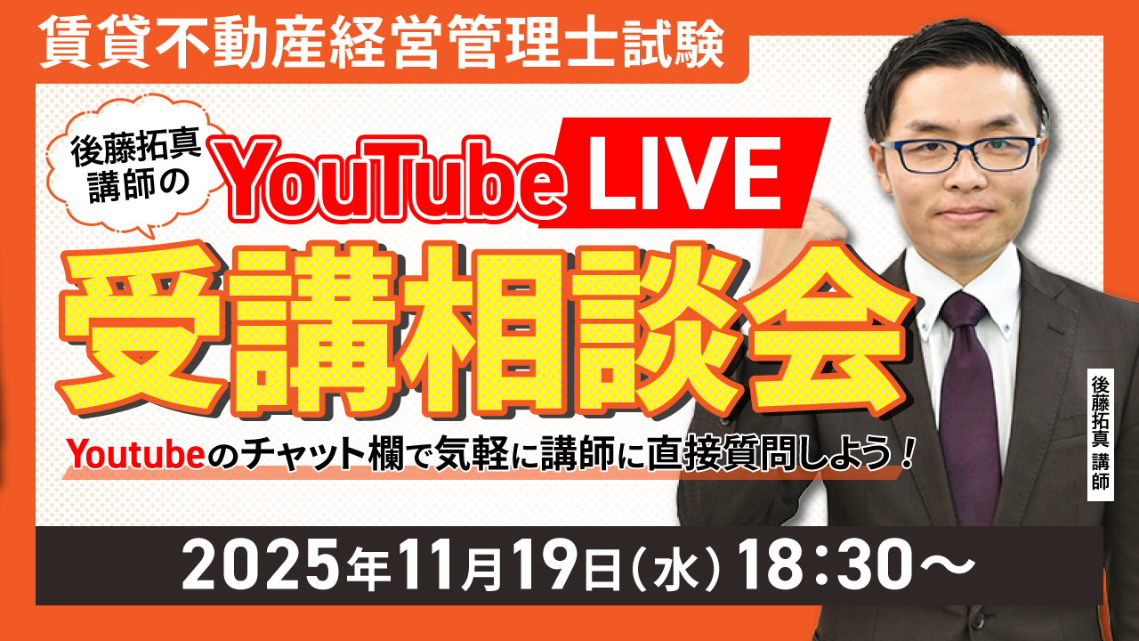 HOME > 賃貸不動産経営管理士試験 > 賃貸不動産経営管理士試験| 後藤拓真講師のYouTubeLIVE受講相談会