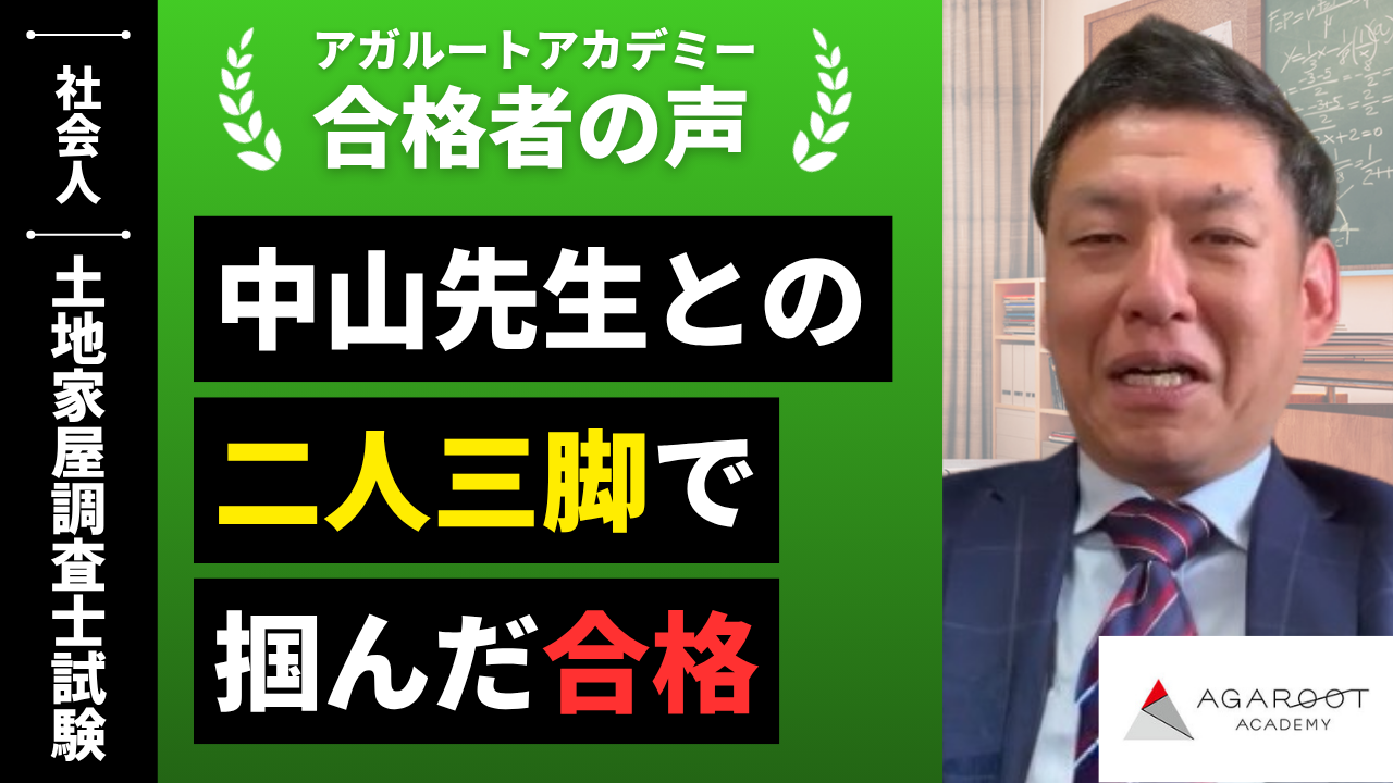中山先生には大変お世話になりました。「トップ合格を目指しましょう」と激励され、大変励みになりましたが、肝心の本番では土地の申請書と作図で同じ筆について解答してしまうという失態をおかしてしまい、トップどころか不合格を覚悟していました。結果合格していたので救われましたが、当日大きな失敗をしても他で取り返せたというのは、中山先生と二人三脚でやってきた貯金があったからこその結果だと思っています。