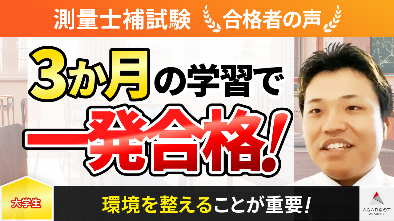 高校生の時に市販の測量士補の参考書を買ったことがありましたが、あまりにも馴染みがなく、専門用語が多いというところで、受験にも至らず、挫折しました。しかし、そんな時にアガルートに出会って本当によかったです。
