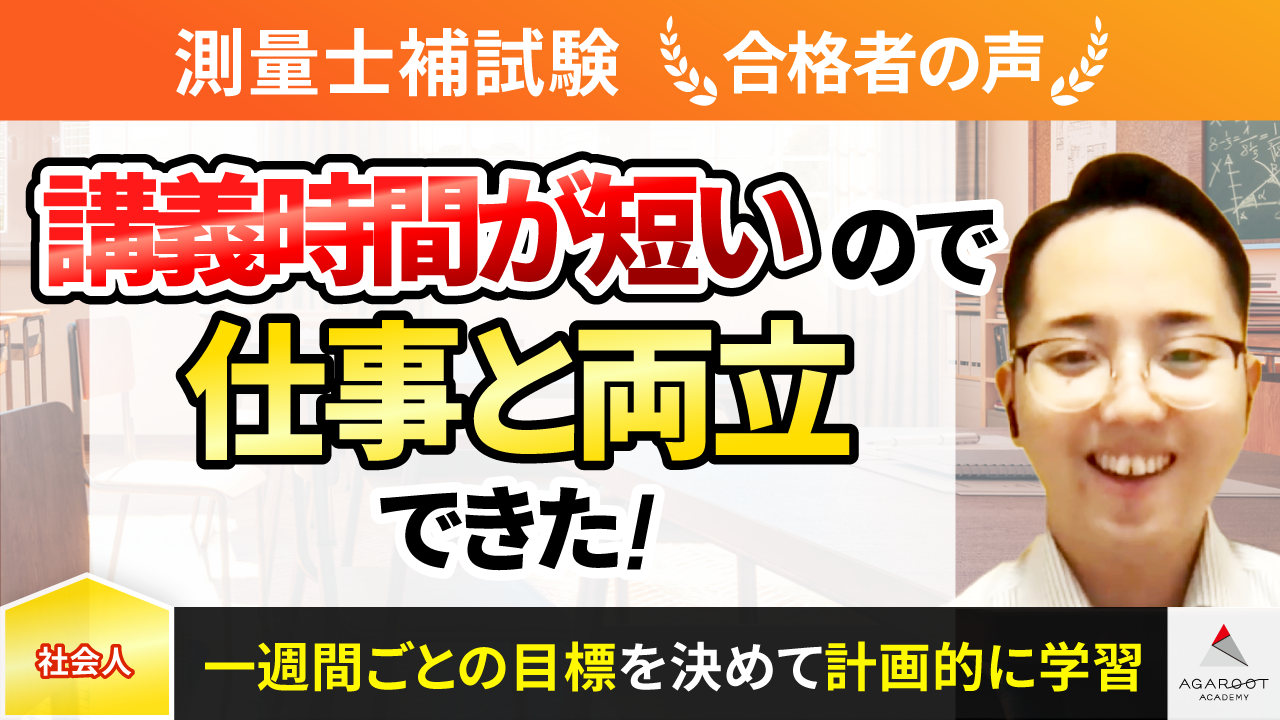 その後、未経験者は測量士補とのダブル受験がスタンダードと知り、アガルートの土地家屋調査士講座を受講する前のお試しとして測量士補講座を利用しました。
