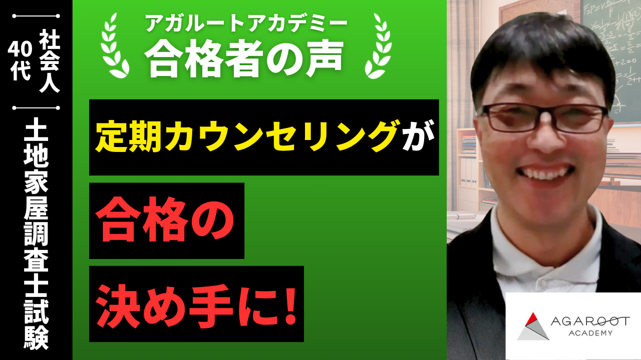 土地家屋調査士の勉強を始めた時は、他校に通学しておりました。なかなか合格には至らず、気分転換にYouTubeでアガルートの中山先生の『令和元年の択一の過去問解説』を見つけ聞いてみると、とても分かりやすく、頭の中に印象強く残りました。それから高野先生の『調査士一日一問』を見たときも、わかりやすい内容だったので、次に結果が出なかった時は、アガルートを受講したいと思いました。