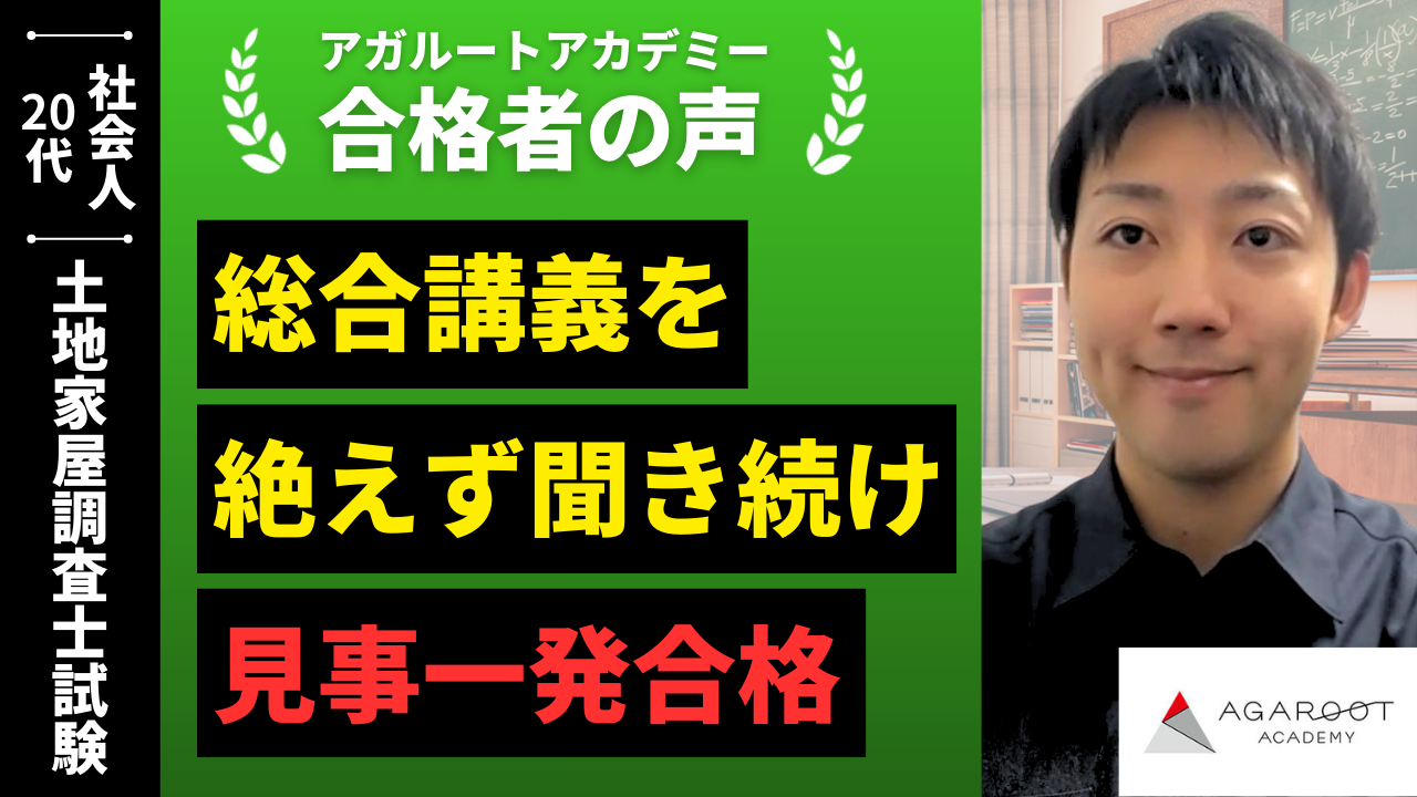 私は「必ず一発で合格する」という強い信念のもと、アガルートを選びました。講師の皆様の分かりやすい説明と、好きな時間に学習できるオンライン講義のスタイルが、自分にとって非常に合っており、最後まで効率的に学習を進めることができました。