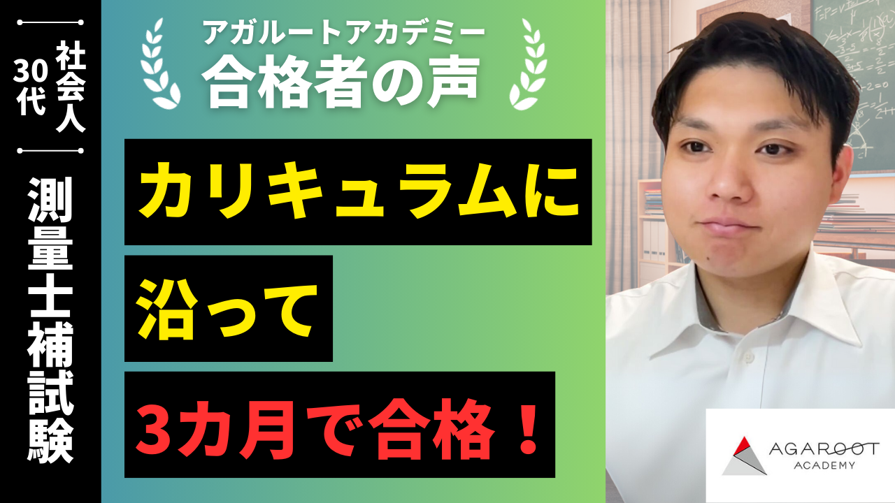 測量士補試験に合格するだけであれば、市販の教材で独学でも合格出来たかもしれません。しかし、測量学の正確な知識を身に付けたいという思いと、調査士試験も目指していたため予備校を検討しました。オンラインの受講を考えており、通信の予備校を探していた所、合格実績、評判、金額、合格特典の全てが魅力的だったのでアガルートの受講を決めました。