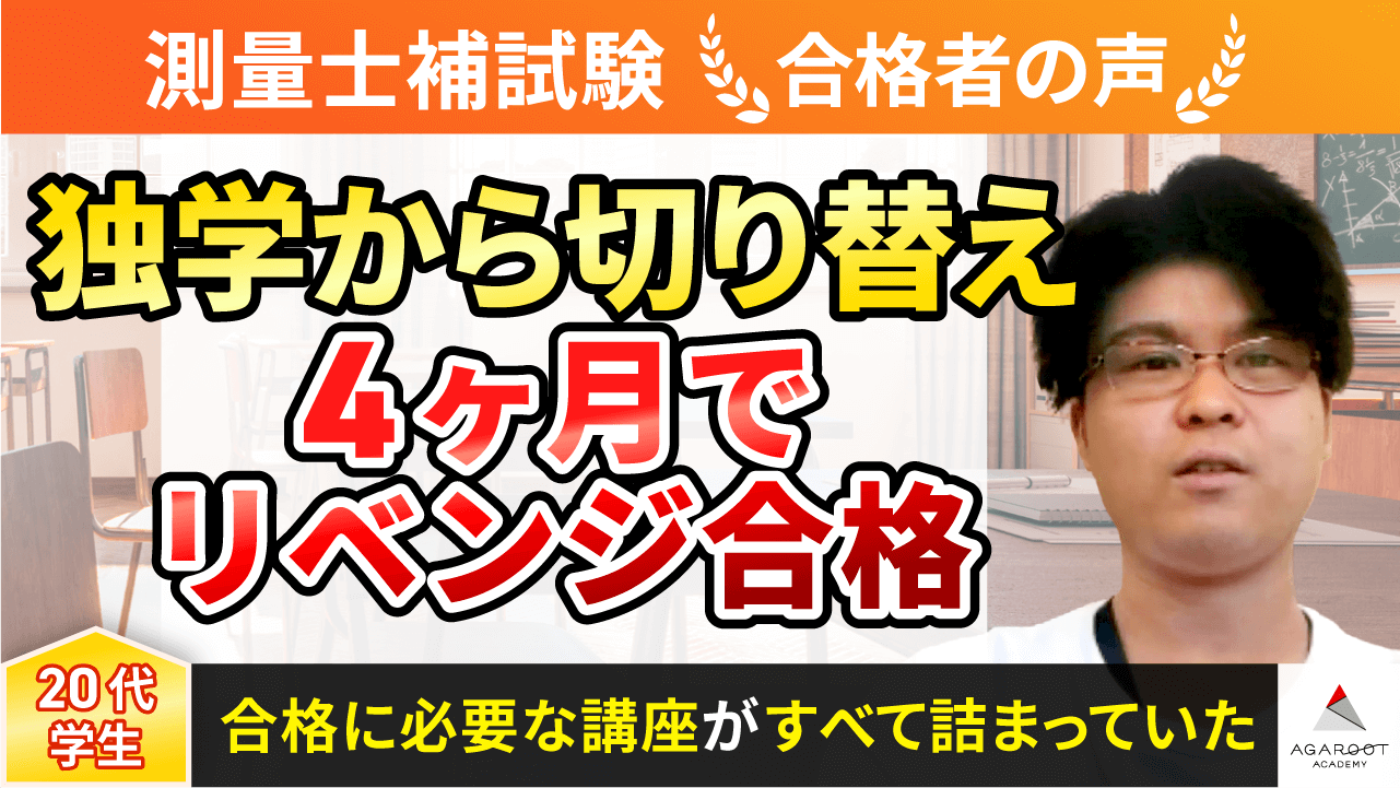昨年測量士補の試験に挑みましたが、不合格となりました。独学での学習でしたので、自分自身の甘さから全く学習に身が入りませんでした。また、購入したテキストも内容のイメージ、計算、勉強の進め方など、ほとんど理解ができませんでした。