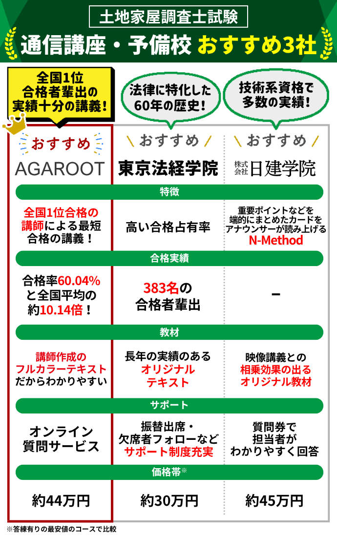50年以上「土地家屋調査士」受験指導で多くの合格者を輩出している実績がある、そして教材がとにかく安価であるというのがメリットです。