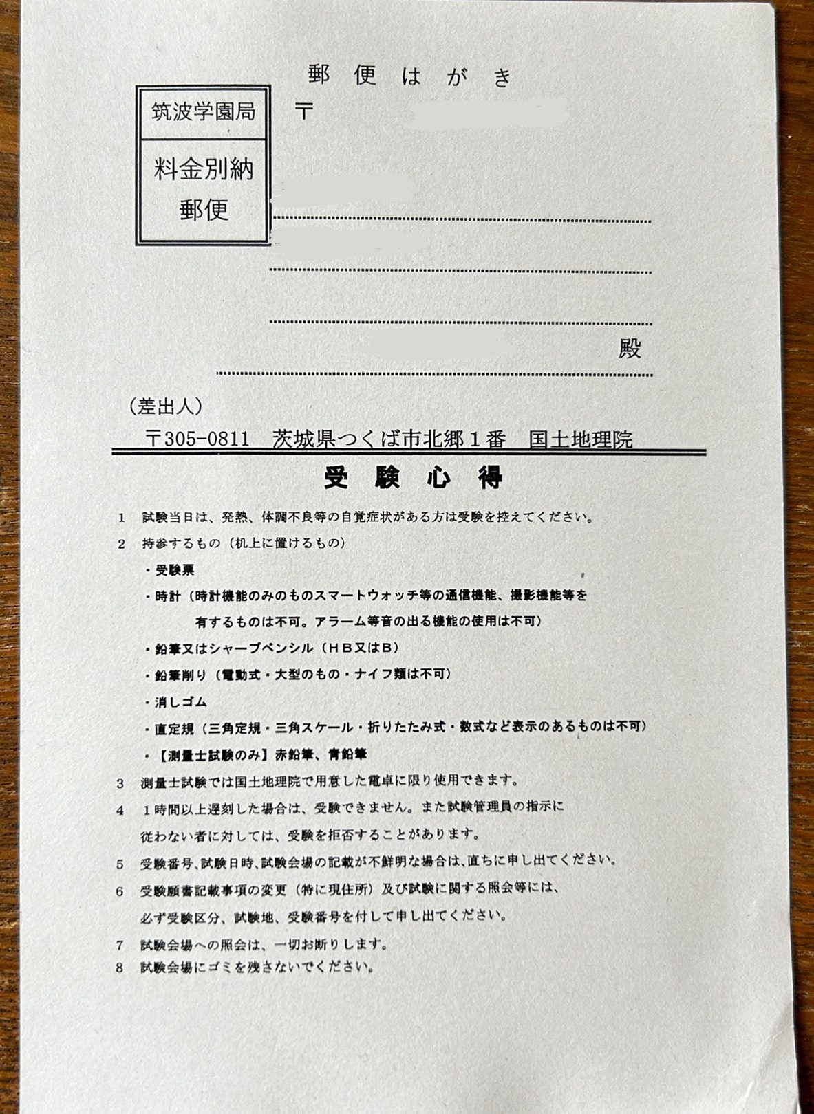 測量士補試験の受験申込み手続きを行った方には、例年通りであれば4月下旬までに受験票が届く予定です。