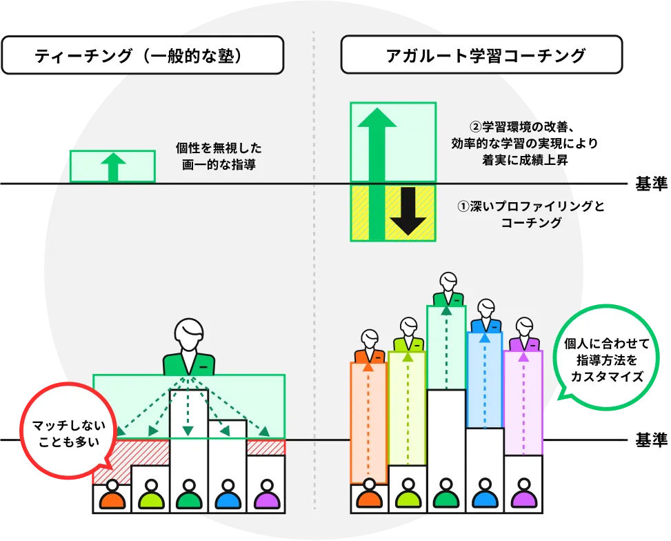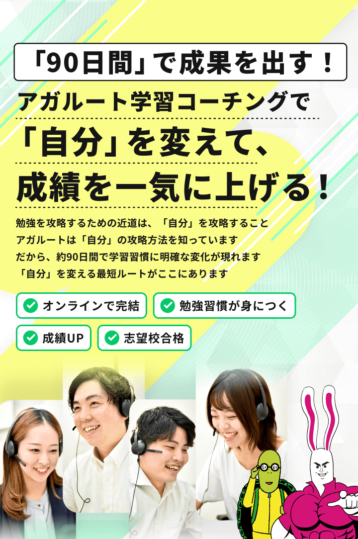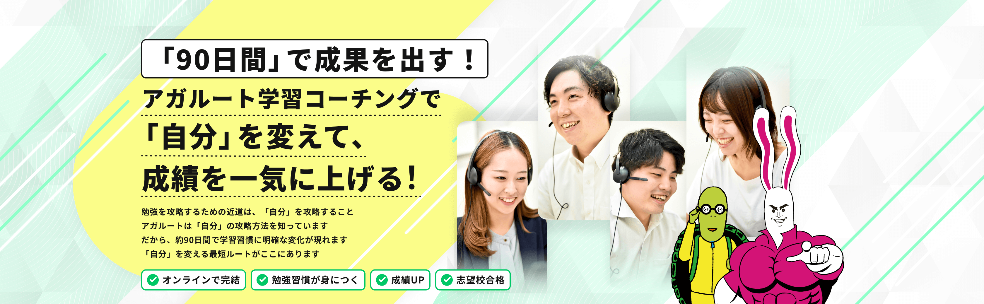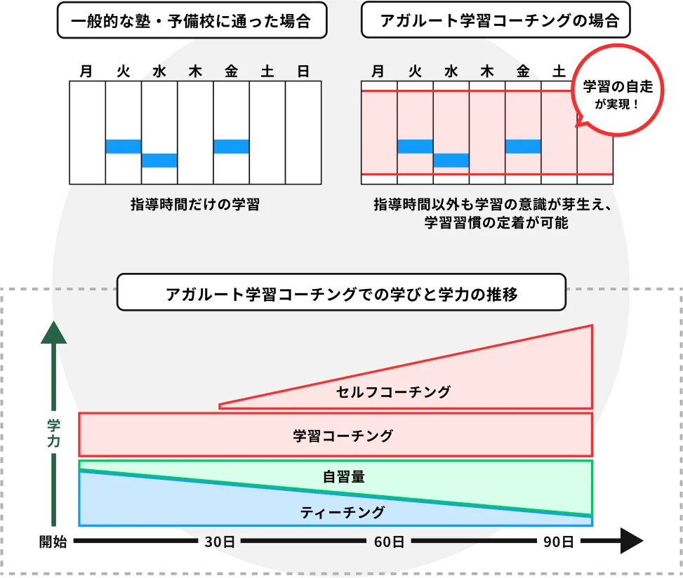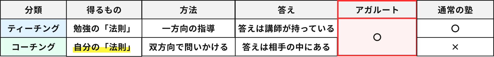 アガルート学習コーチングは、このコーチングを、小学生から高校生・既卒生を対象とした、学習用プログラムにカスタマイズしたアガルート独自の指導メソッドを活用したサービスです。