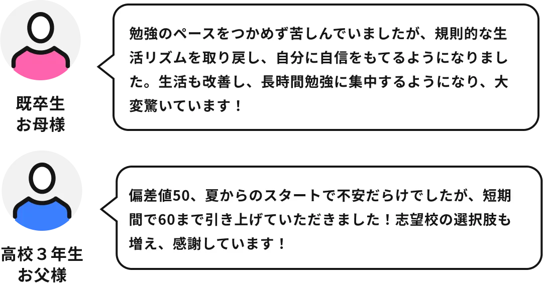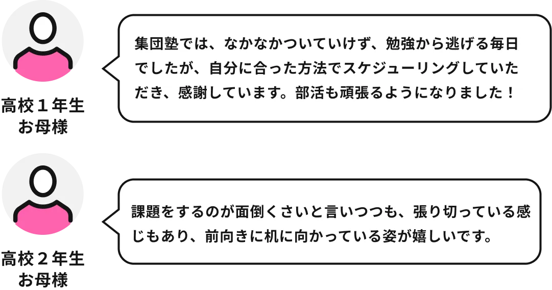 - ゴールが進学である場合、志望校の選定などを含め目標に向けてのサポートとしてアドバイスいたします。