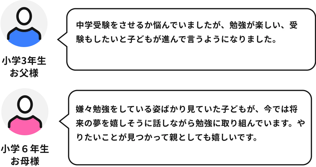 コーチング理論に基づき一人一人の個性に合わせたコーチングを行うことによって、能動的に動くことができ、成功を再現しやすくなります。そのため、今後の学習がスムーズになるだけでなく、今後の人生においても成功を掴みやすくなります。