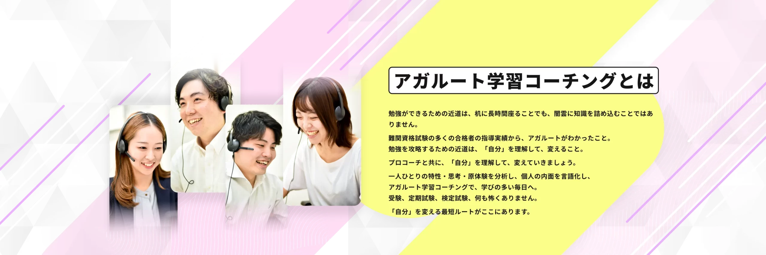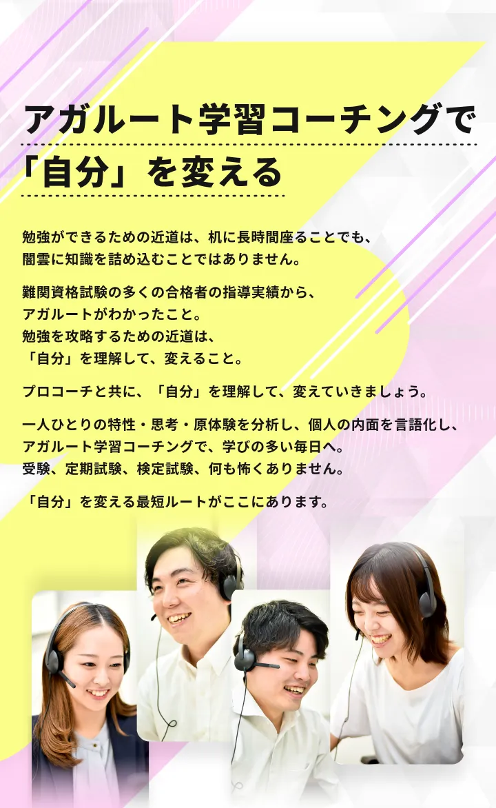 アガルート学習コーチングは、このコーチングを、小学生から高校生・既卒生を対象とした、学習用プログラムにカスタマイズしたアガルート独自の指導メソッドを活用したサービスです。