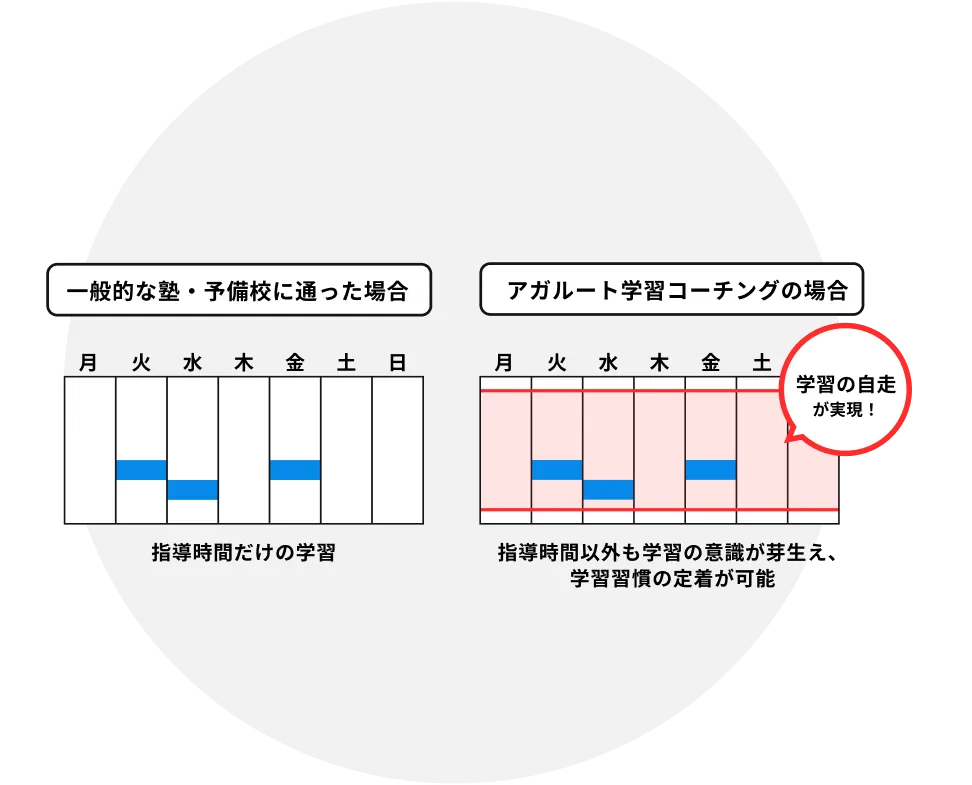 しかし、アガルート学習コーチングでは指導時間だけでなく、学習の意識が常に芽生えるようになるため、学習習慣がしっかりと身につきます。