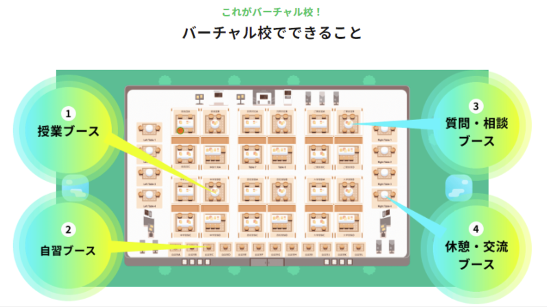 オンラインの授業はもちろん、質問・相談、自習ブースから休憩・交流ブースまで利用可能です。
