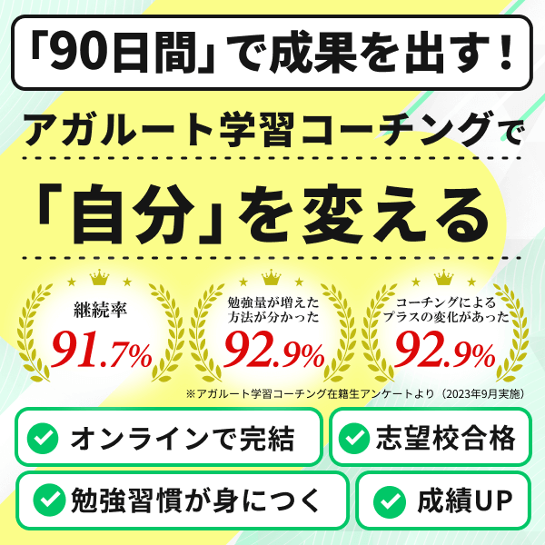 アガルート学習コーチングは1人1人に合った勉強法・学習習慣を確立させ、内申点アップ、志望校合格など目標達成へ導きます。