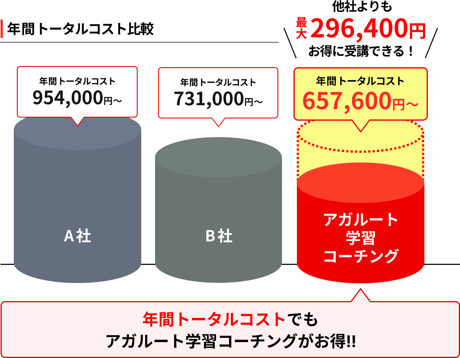 | アガルート学習コーチング | 他のコーチング事業者 | 予備校 | 集団指導塾 | 個別指導塾 | 家庭教師 | |