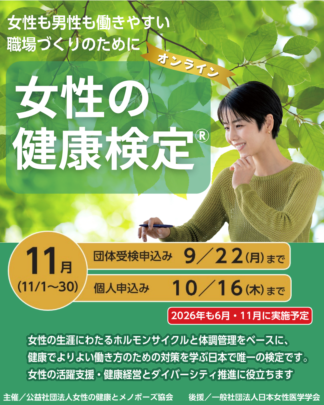2025年後期の女性の健康検定は、11月1日~30日に実施いたします。