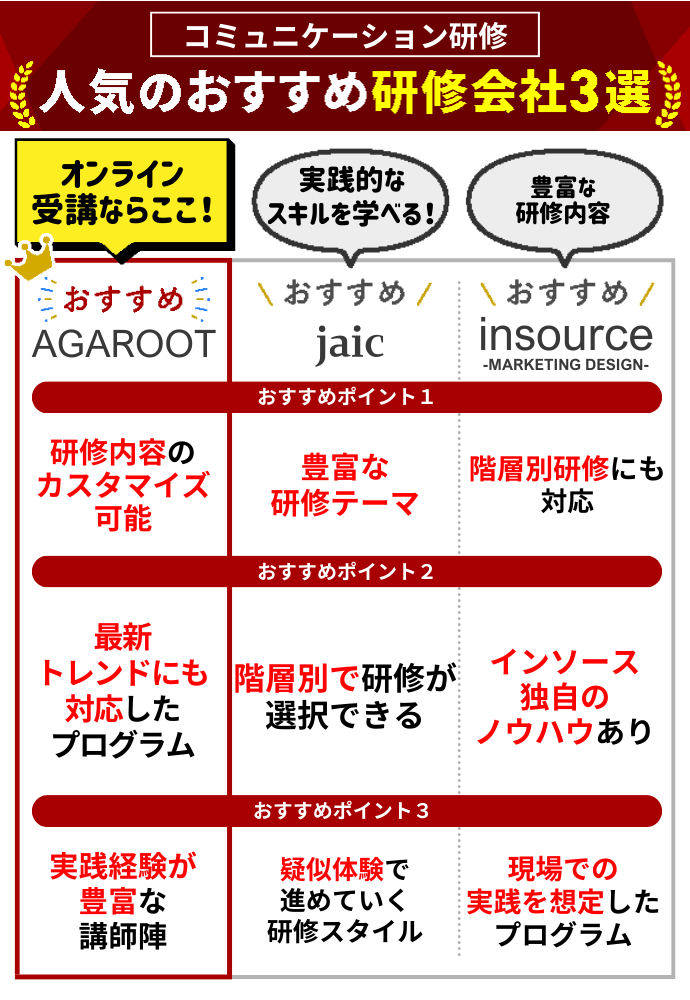 ここでは、コミュニケーション研修の実績が豊富なおすすめの会社を3社紹介します。
