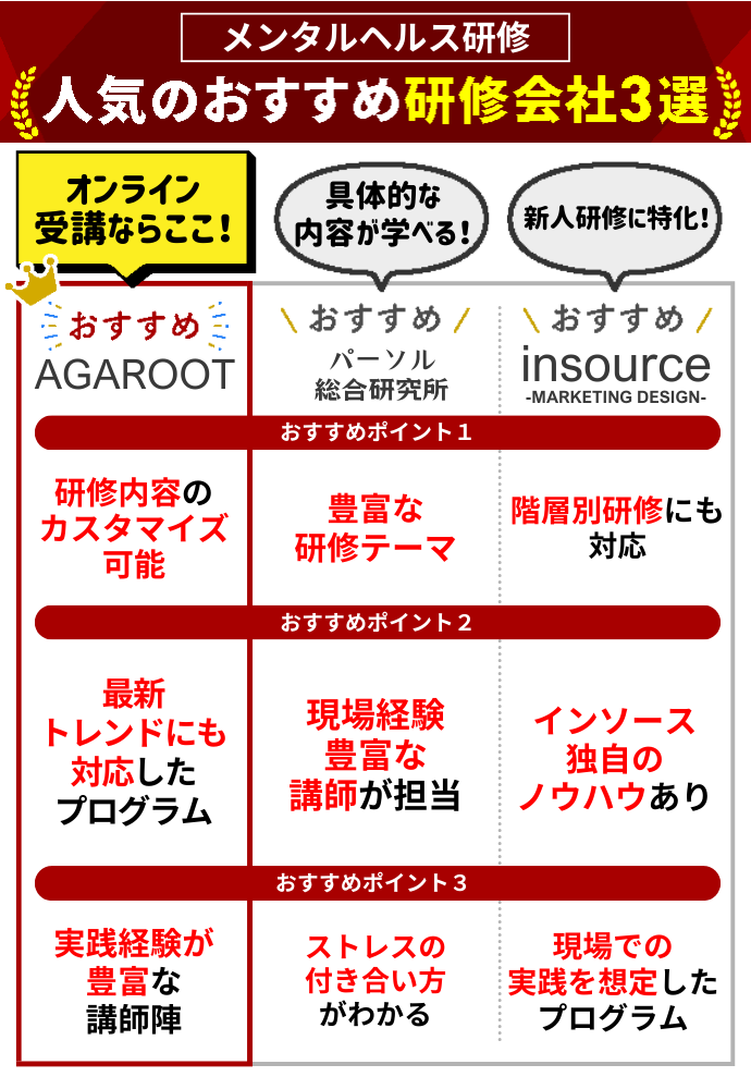 それぞれの研修会社の特徴やメンタルヘルス研修の特徴にも触れるので、参考にしてください。