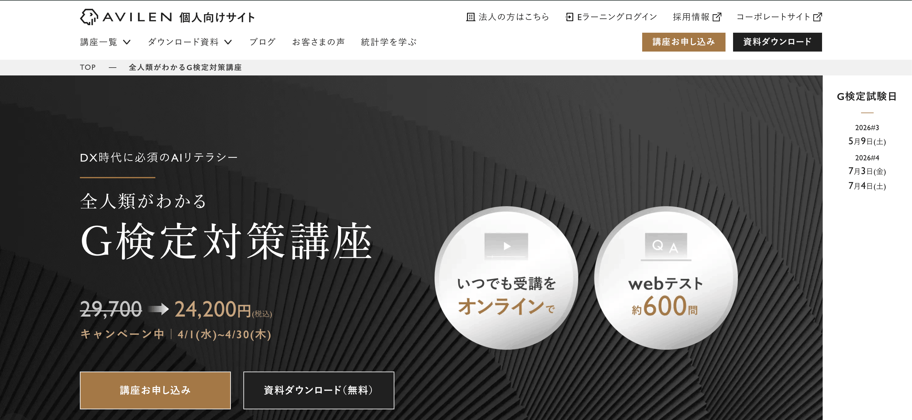 | AVILEN | ・全人類がわかるG検定対策講座 | 29,700円 | 約30時間(うち講義動画時間13時間) | ・オンデマンド講義動画 ・講義資料 ・Webテスト(600問) | ・eラーニング |