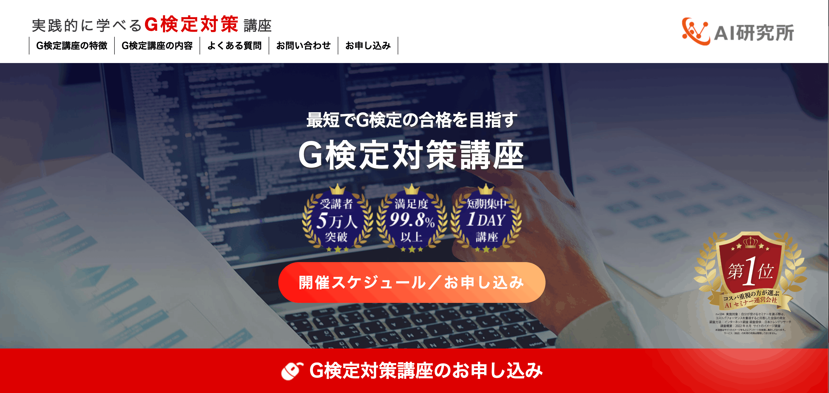 | AI研究所 | ・G検定対策講座 | 会場受講:53,800円 ライブウェビナー:53,800円 eラーニング:44,000円 | 10:00〜17:30 | ・自社開発のカリキュラム | ・詳細は公式ページをご覧ください。 |