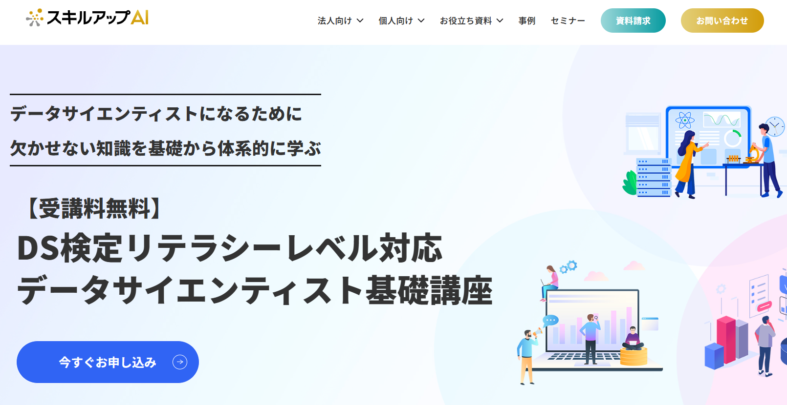 スキルアップAIは、「データサイエンティスト基礎講座」を無料で提供しており、DS検定の出題範囲に完全対応しています。まずは費用をかけずに始めたい方に最適な選択肢です。