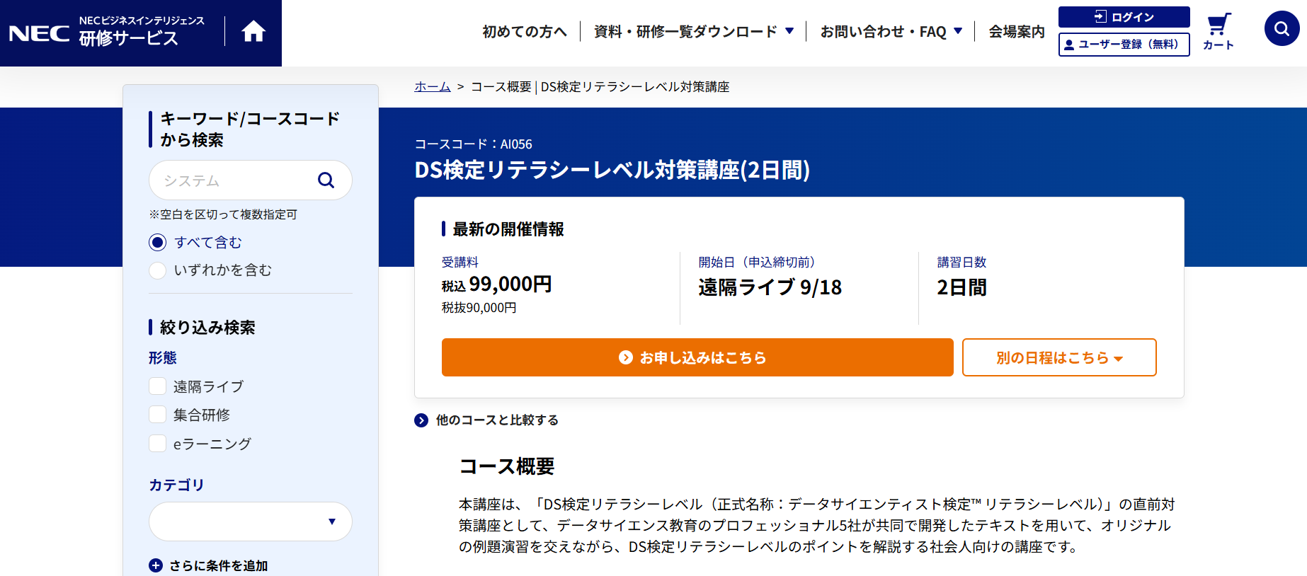 | NECマネジメントパートナー | DS検定リテラシーレベル対策講座 | 99,000円 | 2日間:14時間 | 遠隔ライブ研修、電子教材 | 詳細は公式ページをご覧ください |