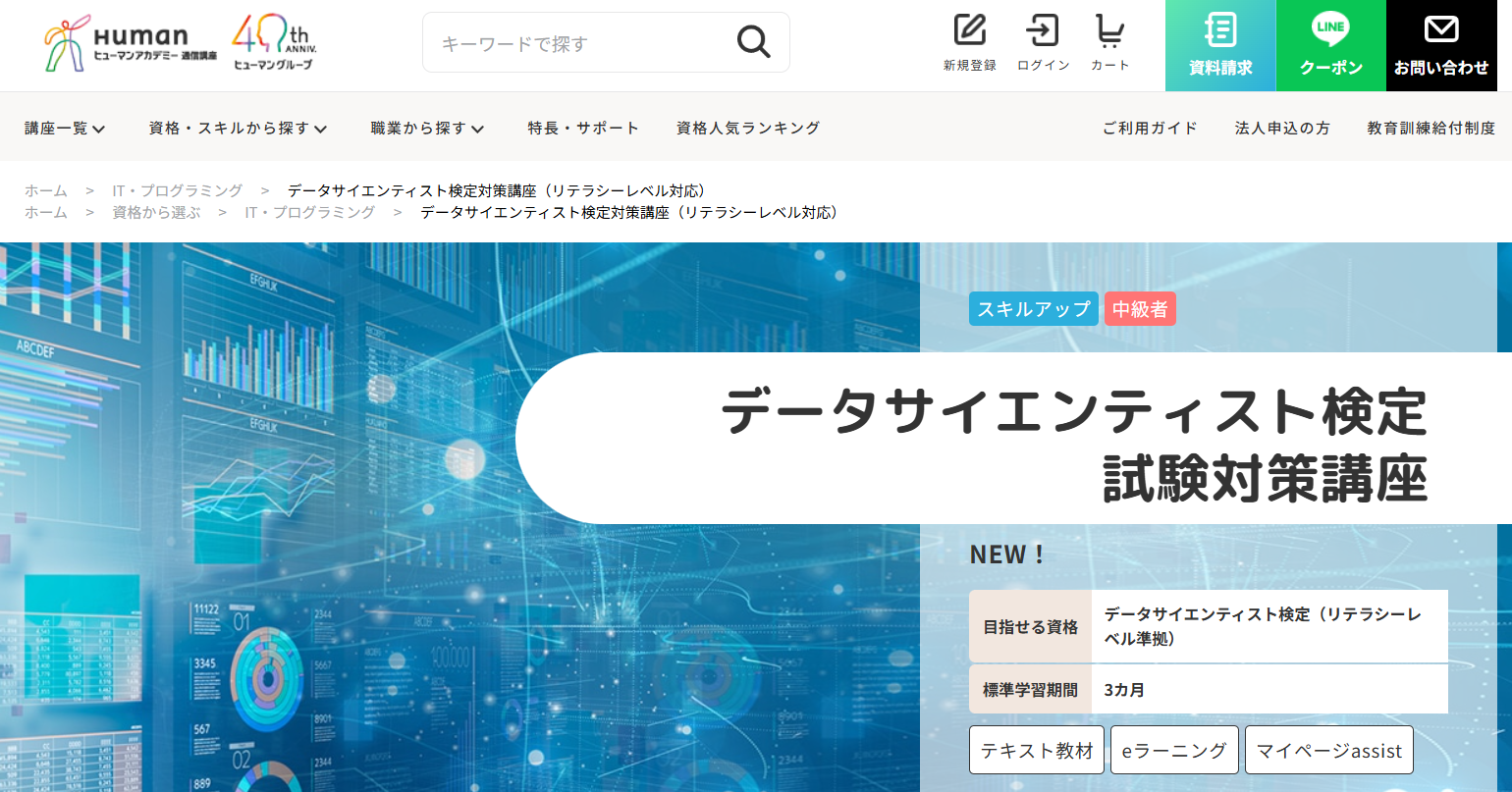 | ヒューマンアカデミー | データサイエンティスト検定試験対策講座 | 19,800円 | 約12時間 | 講義動画、デジタルテキスト | 学習進捗管理などができる「マイページassist」 |