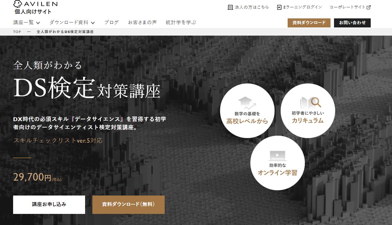 AVILENの「全人類がわかるDS検定対策講座」は、データサイエンス初心者に特化したオンライン講座。