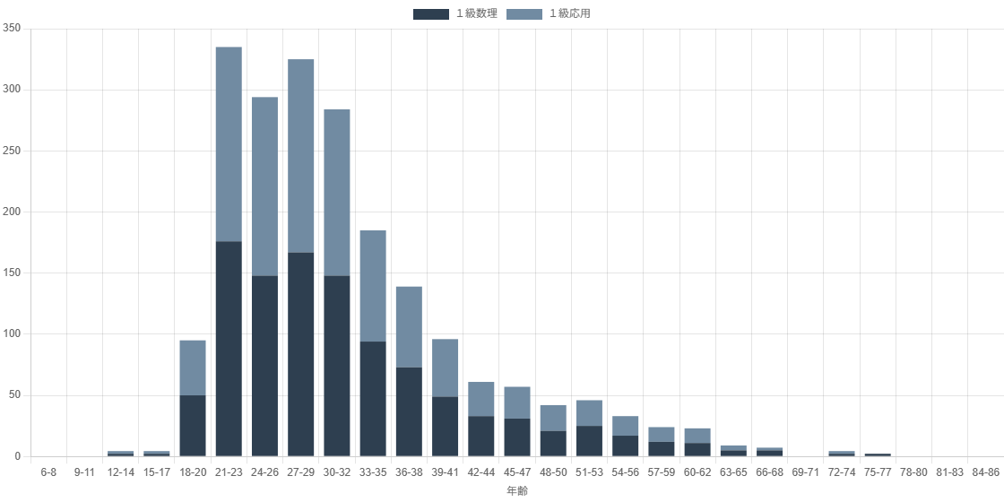受験者の年齢分布は準1級同様に20代後半から30代が多くなっており、実務でデータを活用している経験豊富な層が多く受験していることが読み取れます。